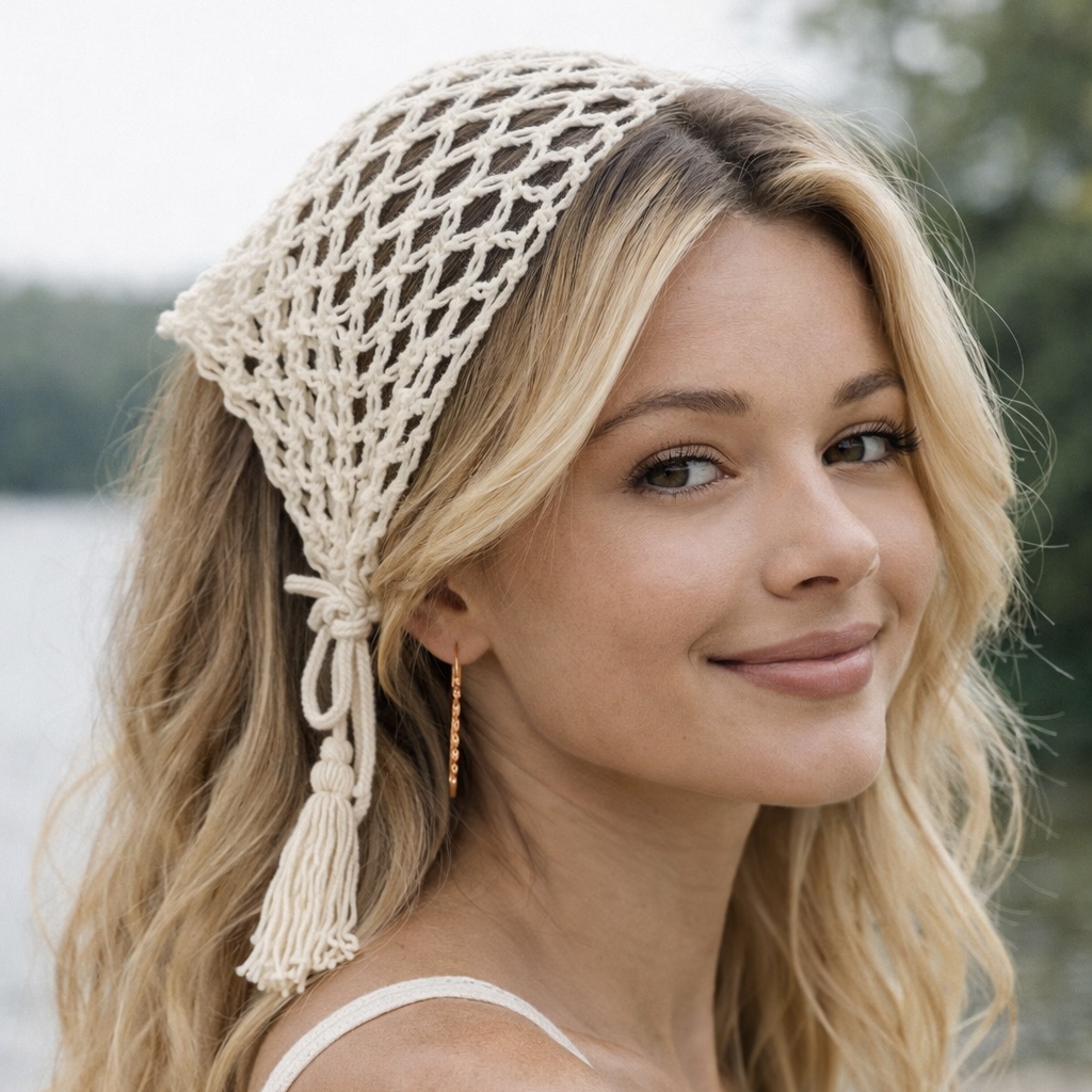 Bandana feita em crochê com fio de algodão com trama aberta e leve,possui amarraçao ajustável e acabamento em tassel. Um acessorio versátil, natural e cheio de charme.