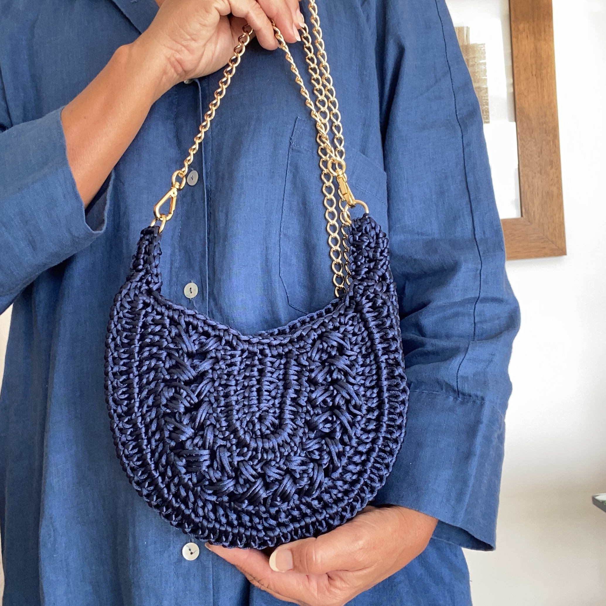 Feita à mão em crochê em cordão de cetim, o ponto em relevo valoriza o trabalho artesanal ,criando textura e movimento. Alça curta em crochê , longa com ferragem dourada.Compacta e cheia de estilo,é perfeita para eventos especiais, passeios ou para dar um charme ao visual do dia dia.
