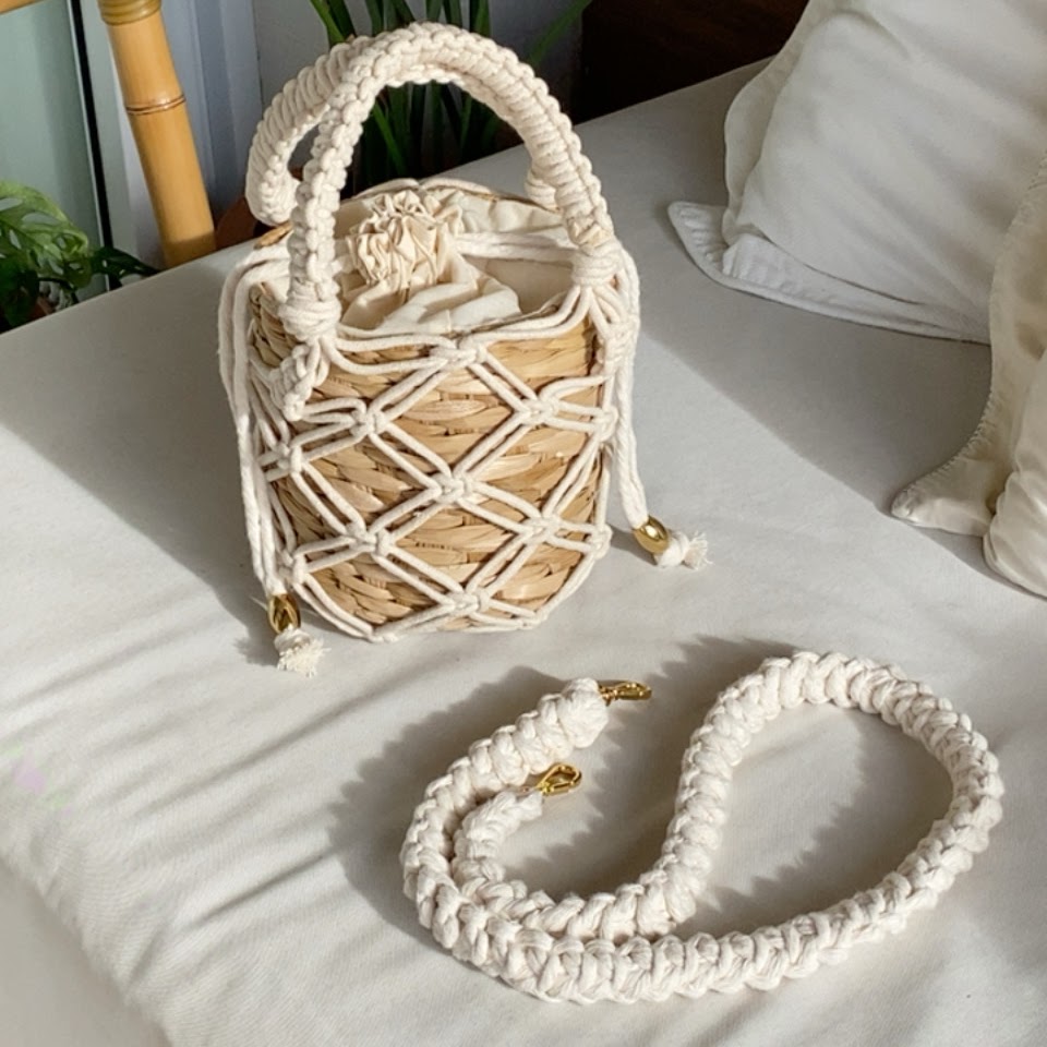 A bolsa Taormina de palha natural com acabamento artesanal em macramê na cor off white. Seu design inclui uma alça longa (1 m) de corda trançada confortável e removível, além de uma bolsa interna forrada com tecido e fechamento para manter seus itens protegidos. É um acessório leve e versátil, que combina com diversos estilos e ocasiões informais.